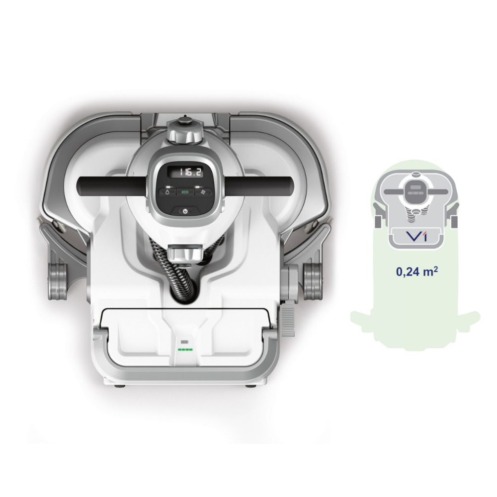 Avec une pression de 30 kg, une vitesse de rotation de 350 tours/min et une puissance de nettoyage réglable via écran, la V1 garantit des performances égales, voire supérieures, à une autolaveuse standard. Son moteur d’aspiration intelligent ajuste la puissance selon la quantité d’eau à aspirer, optimisant l’autonomie jusqu’à 2h avec une batterie lithium-ion interchangeable.